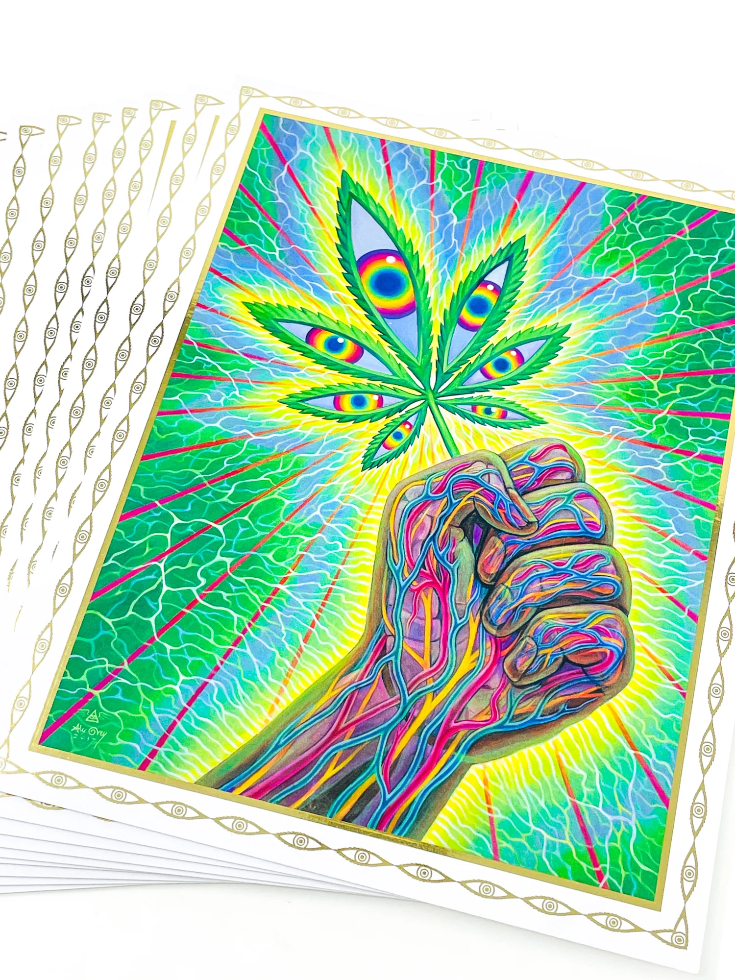 This full color gloss prayer card features Cannafist painting by Alex Grey completed in 2017, surrounded by a gold foil border design.