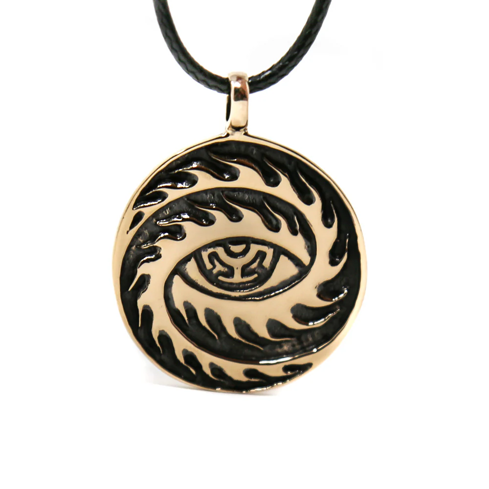 This pendant's design is derived from the eyes of the God Heads in the Net of Being painting by Alex Grey. The spiral flaming eye represents the powerful fire of potentiality surrounding each of the infinite perspectives of the Divine.